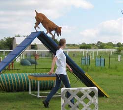 It is my intent through this website to show the true pit bull as it should appear when it is loved and cared for by a responsible owner. Because a picture is worth a thousand words, these particular pages should speak loudly. I want to thank the owners who gave me permission to post their dog's picture on these pages. As you look through these pages, notice how very different each dog looks from the others. This is one reason why breed-specific legislation just doesn't work - determining what is and is not a "pit bull" is very difficult and often subjective. There are a number of dogs in these photos that I'm not convinced are even part pit bull, but their photos are here, so someone thinks they are. If you have a photo to share, please read the guidelines, then email me. The dog shown in the photo above is my dog Felanie, age six, on the agility field. You can read her story here. Page 1 - 2 - 3 - 4 - 5 - 6 - 7 - 8 - 9 - 10 - 11 - 12 - 13 - 14