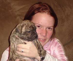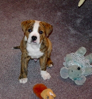 is our boy Dozer at age four. He is possibly a pit/lab mix. You can read