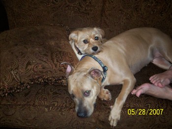 Cassie and BrandyContributed by Alicia "The attached photo is a picture of our pit bull Cassie and our recently rescued terrier, Brandy. Brandy has been severely neglected and abused. When we first got her, she would shake constantly and was deathly afraid to go outside. Cassie has become Brandy's buddy and has really coaxed her out of her shell." 5/30/07 |