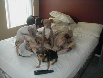 "My pit bull's name is Princess Peach, the small chihuahua's name is Scrappy, and the mini lab who is in the background is Shadow.... they are my babies!" 11/30/06